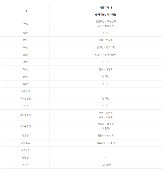 - 인천 1,2호선, 신분당선,용인,의정부, 경강선, 코레일 서울시 외 구간은 승차. 하차 불가합니다.