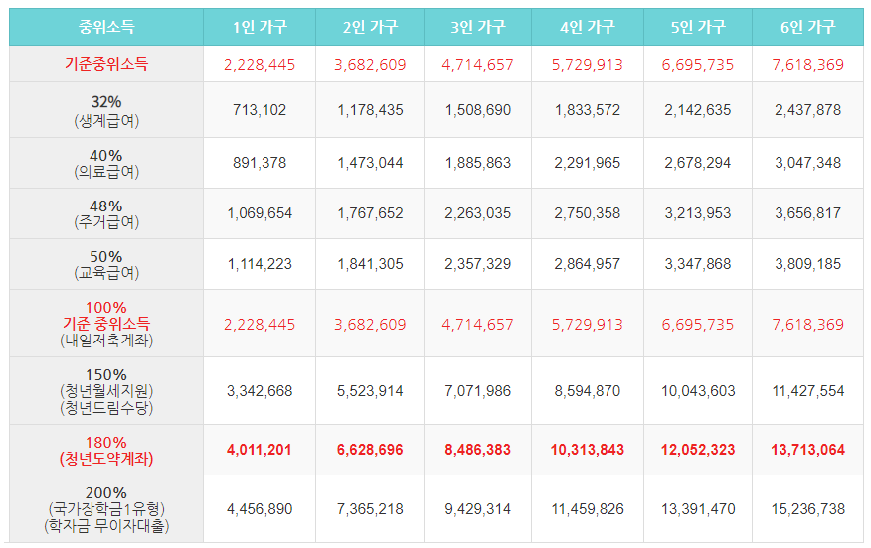 기본 중위소득을 기준으로 청년도약계좌, 청년월세지원, 청년드림수당, 국가장학금, 학자금 무이자 대출도 신청자격이 정해집니다.