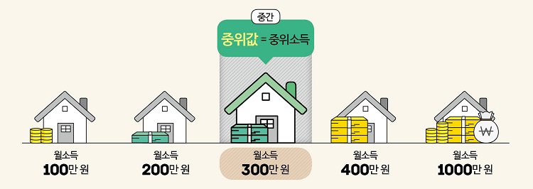 중위소득이란 국민가구 소득을 순서대로 나열할 때 중간에 위치한 소득입니다.