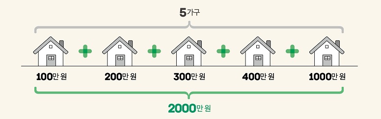 5 가구의 평균소득은 월 400만 원입니다. 중위소득 월 300만 원은 평균소득 월 400만 원과 같지 않습니다.