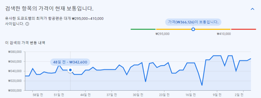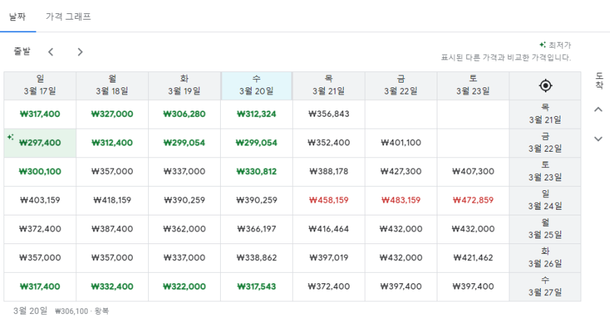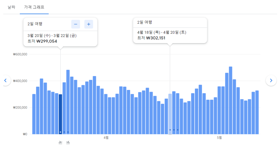 - 가격 그래프는 동일한 여행기간을 출발일을 다르게 했을 때의 가격추이를 보여줍니다.