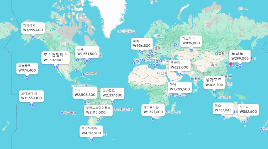 - 동일한 여행기간동안 갈 수 있는 전 세계 가장 저렴한 항공권을 보여줍니다.