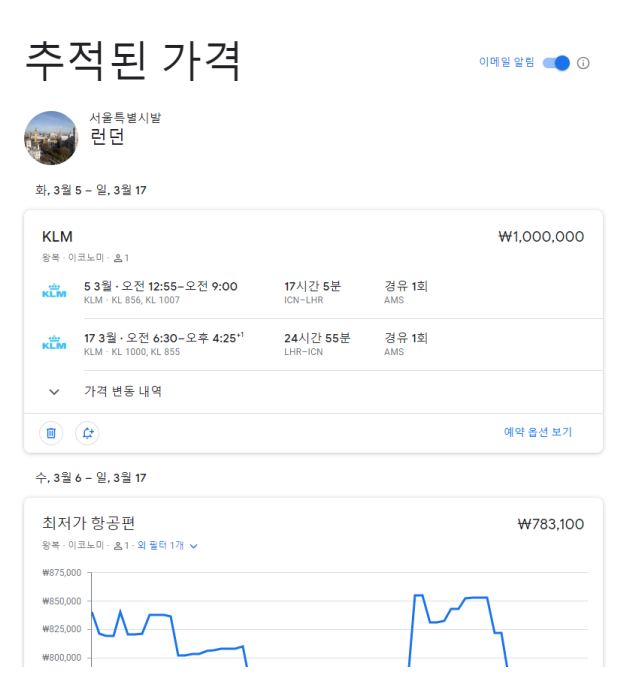 - 첫 페이지 항공편으로 다시 돌아오면 지금까지 검색했던 모든 항공권의 가격을 추적보기 할 수 있습니다.
