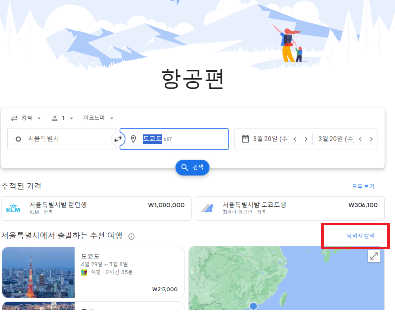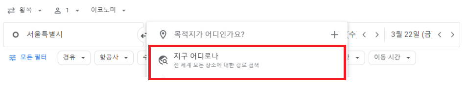 - 목적지는 지구 어디로나를 선택하고 출발일과 도착일을 입력합니다.